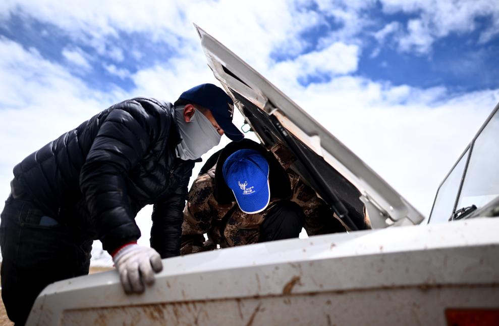 在前往卓乃湖保護站的途中,可可西裏管理處卓乃湖保護站隊員才索加(左)和隊友在維修出現故障的車輛(6月16日攝)。新華社記者 張宏祥 攝