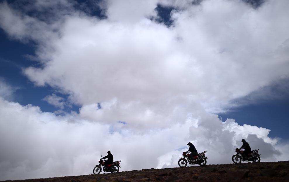 可可西裏管理處卓乃湖保護站隊員在卓乃湖附近騎行巡護(6月17日攝)。新華社記者 張宏祥 攝