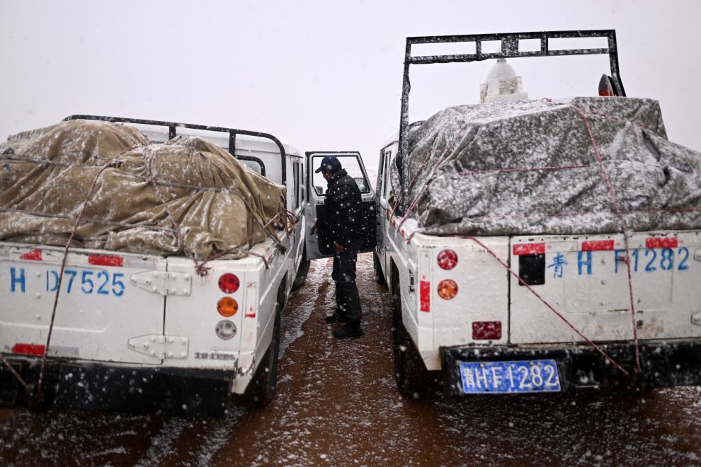 可可西裏管理處卓乃湖保護站隊員在前往卓乃湖保護站途中遭遇大雪(6月16日攝)。新華社記者 張宏祥 攝