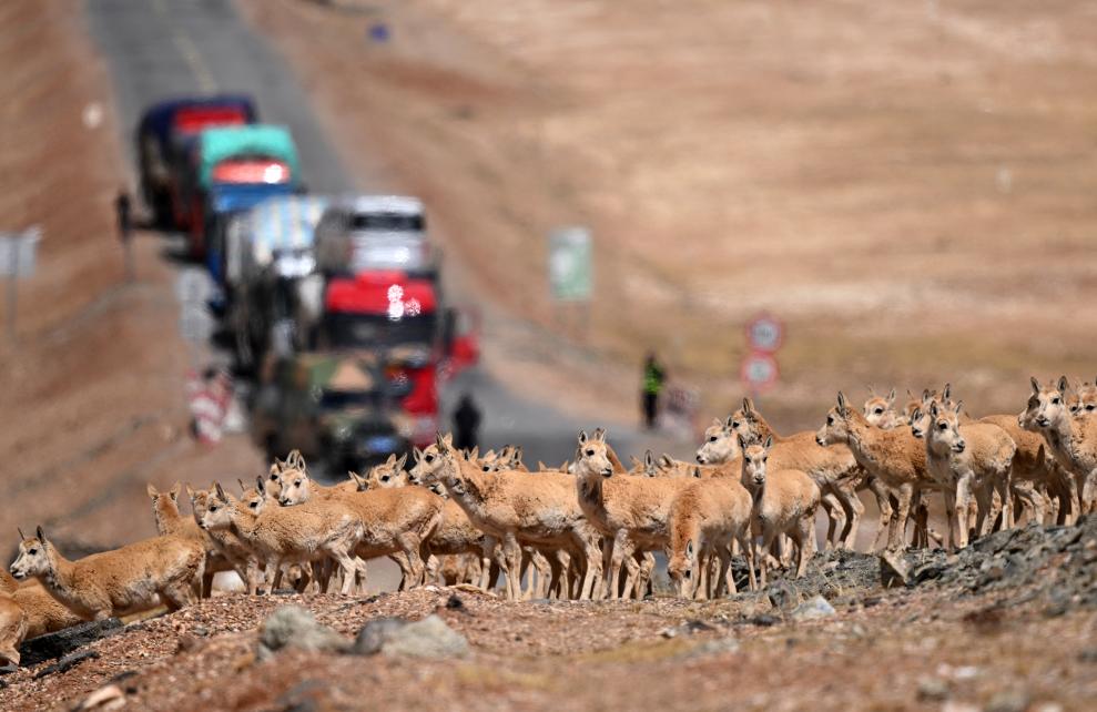 一群待產(chan) 雌性藏羚羊正在通過青藏公路前往可可西裏卓乃湖產(chan) 仔(5月29日攝)。新華社記者 張宏祥 攝
