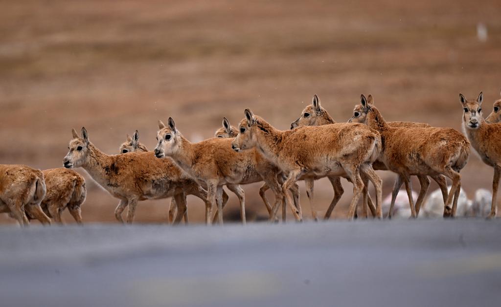 一群待產(chan) 雌性藏羚羊在通過青藏公路前往可可西裏卓乃湖產(chan) 仔(5月28日攝)。新華社記者 張宏祥 攝