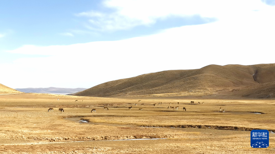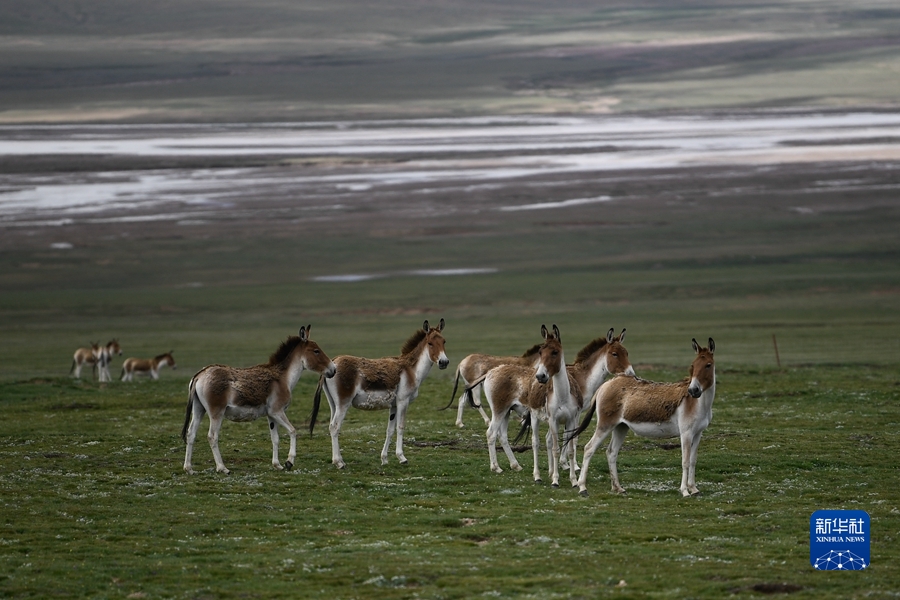 2022年3月12日,在三江源國家公園黃河源園區內(nei) ,一群藏野驢在草灘上吃草。新華社記者 呂雪莉 攝