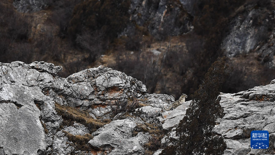 一隻雪豹在位於(yu) 三江源國家公園瀾滄江源園區內(nei) 的青海省玉樹藏族自治州雜多縣昂賽大峽穀內(nei) 休息(2023年2月21日攝)。新華社記者 張宏祥 攝