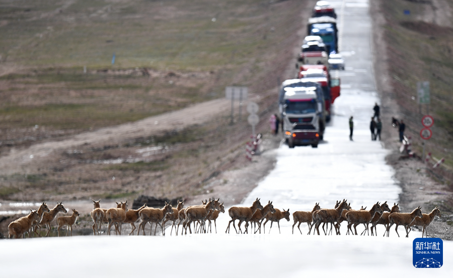 一群藏羚羊通過青藏公路前往青海三江源地區(2023年7月28日攝)。新華社記者 張宏祥 攝