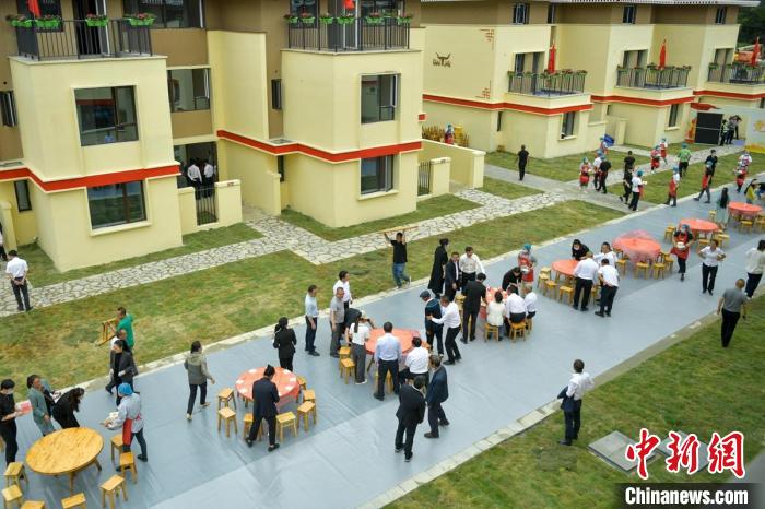 瀘定縣磨西鎮大杉樹村(幸福新村)集中安置點領取新房鑰匙後,村民們(men) 正在擺壩壩宴。中新網記者 劉忠俊 攝