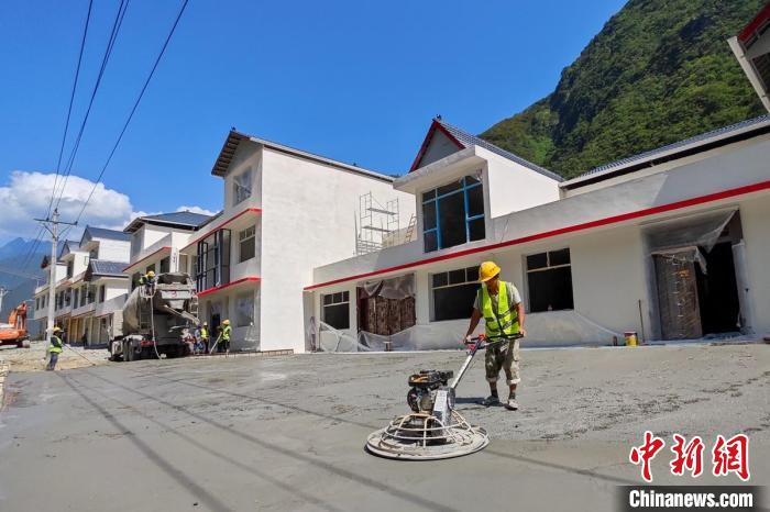 瀘定縣得妥鎮沙壩村村民統規自建房屋正在加緊屋外地麵水泥鋪設。中新網記者 劉忠俊 攝