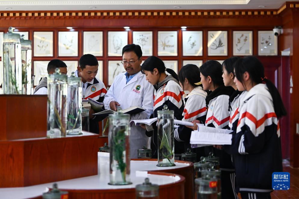 9月8日,在果洛藏族自治州職業(ye) 技術學校,藏醫醫療與(yu) 藏藥專(zhuan) 業(ye) 學生在草藥標本館內(nei) 學習(xi) 辨認藥材。新華社記者 張龍 攝