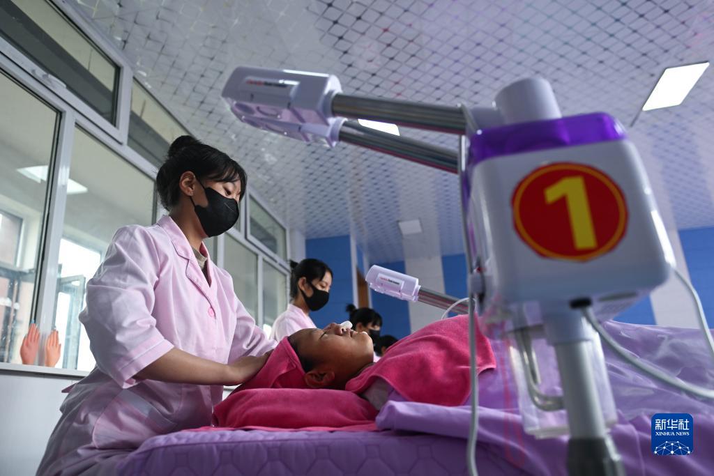 9月8日,在果洛藏族自治州職業(ye) 技術學校,美發與(yu) 形象設計學生在學習(xi) 美容實訓課程。新華社記者 張龍 攝