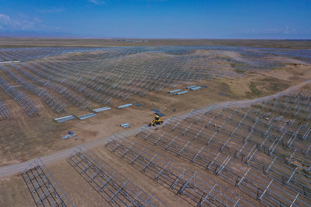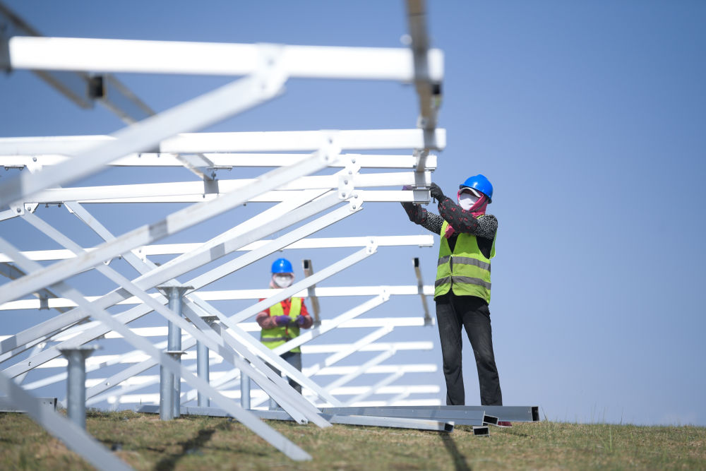 2022年6月8日,工人在黃河上遊水電開發有限責任公司海南基地共和縣100萬(wan) 千瓦光伏項目施工。新華社記者 張龍 攝