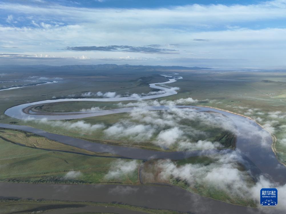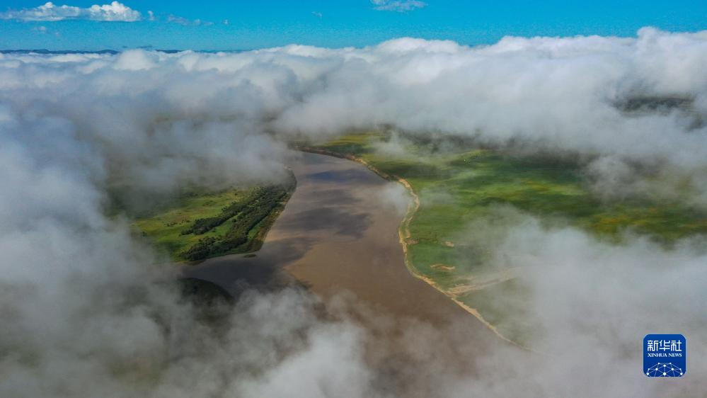 這是8月22日清晨在四川省阿壩藏族羌族自治州若爾蓋縣唐克鎮拍攝的黃河九曲第一灣景色(無人機照片)。新華社記者 邢廣利 攝
