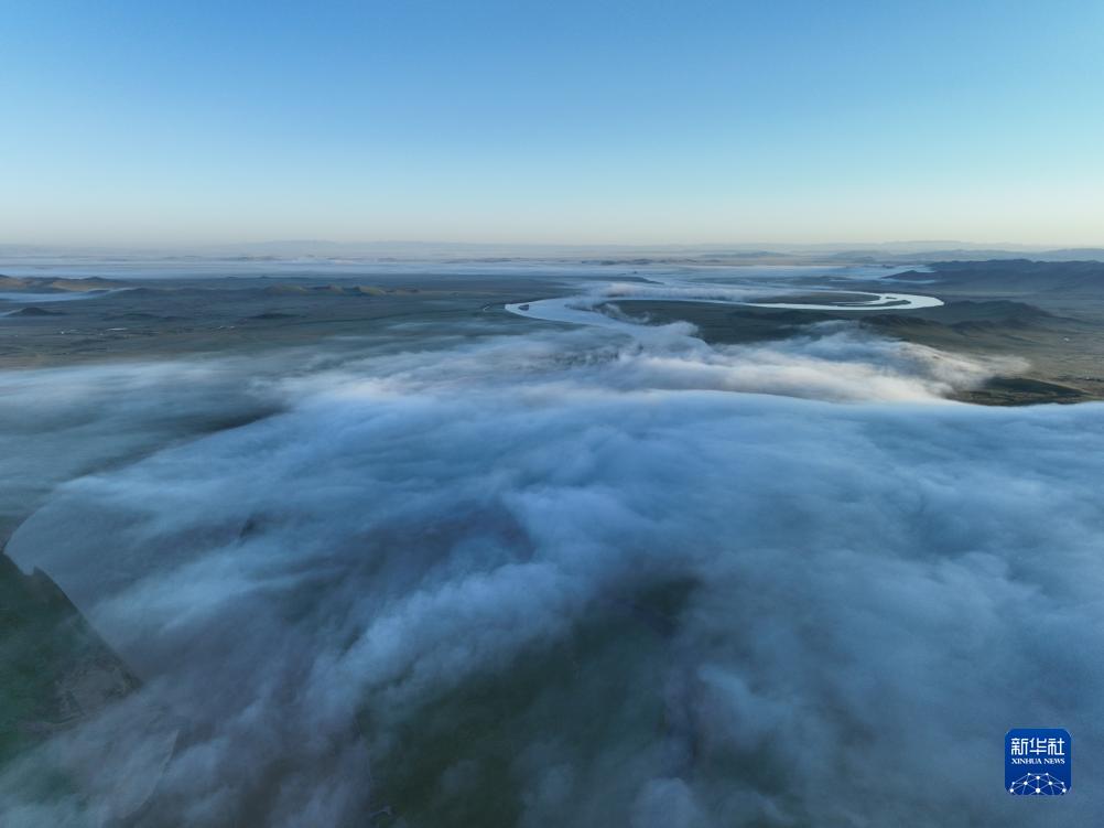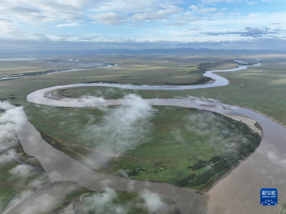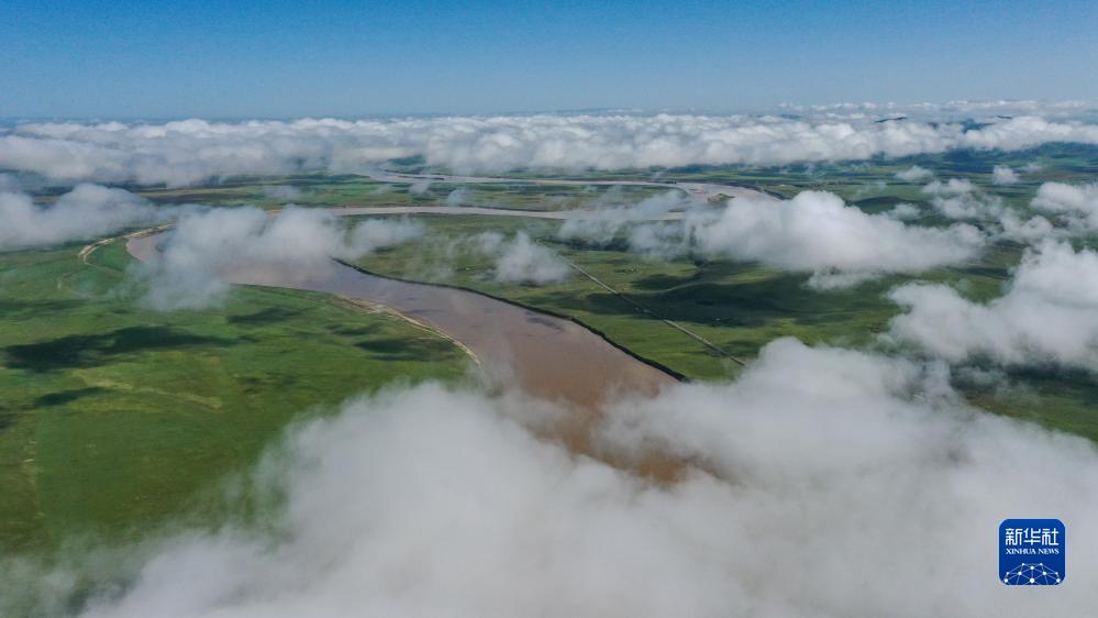 這是8月22日清晨在四川省阿壩藏族羌族自治州若爾蓋縣唐克鎮拍攝的黃河九曲第一灣景色(無人機照片)。新華社記者 王曦 攝