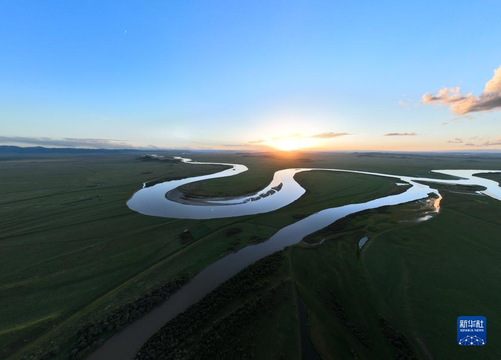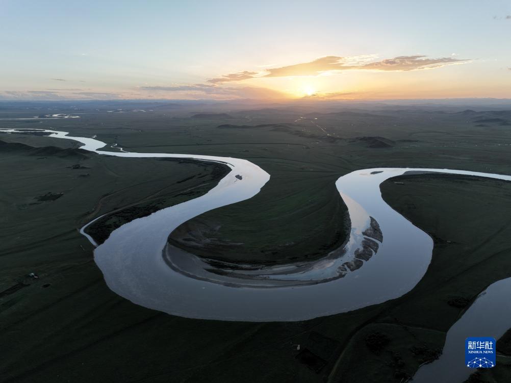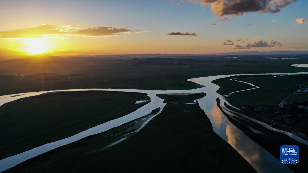 這是8月21日在四川省阿壩藏族羌族自治州若爾蓋縣唐克鎮拍攝的黃河九曲第一灣落日(無人機照片)。新華社記者 邢廣利 攝