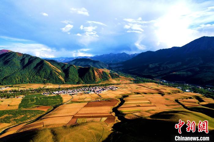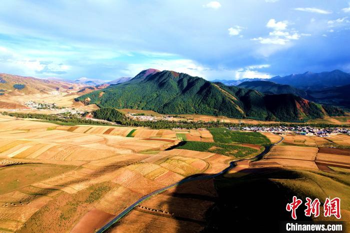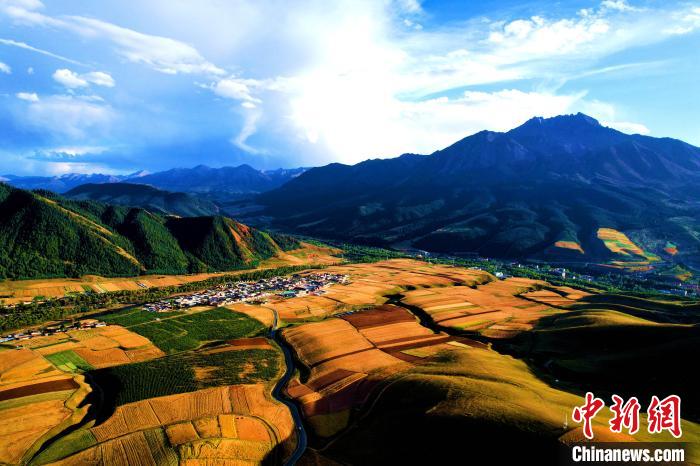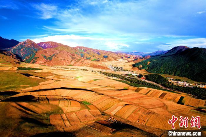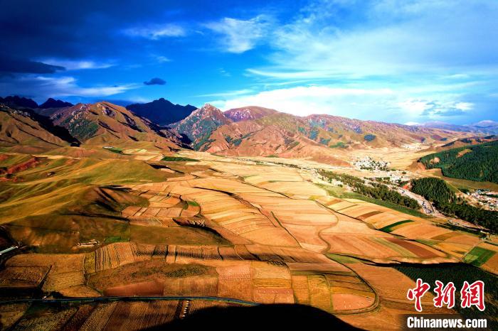 圖為(wei) 航拍祁連山金色田野與(yu) 山巒交相輝映。薛蒂 攝
