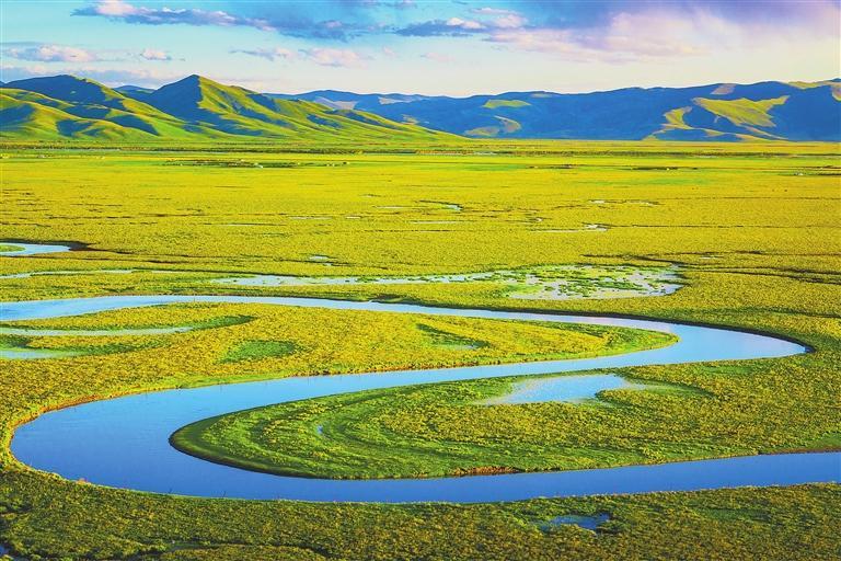 黃河首曲,阿萬(wan) 倉(cang) 濕地,綠毯似的草地一望無際,支流如飄帶般蜿蜒其間。