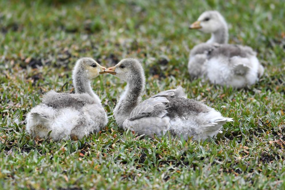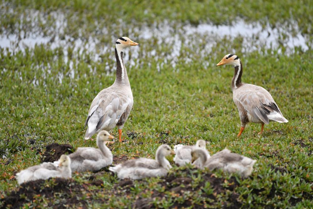 斑頭雁幼鳥在甘肅尕海則岔國家級自然保護區的尕海濕地嬉戲。 新華社記者 陳斌 攝