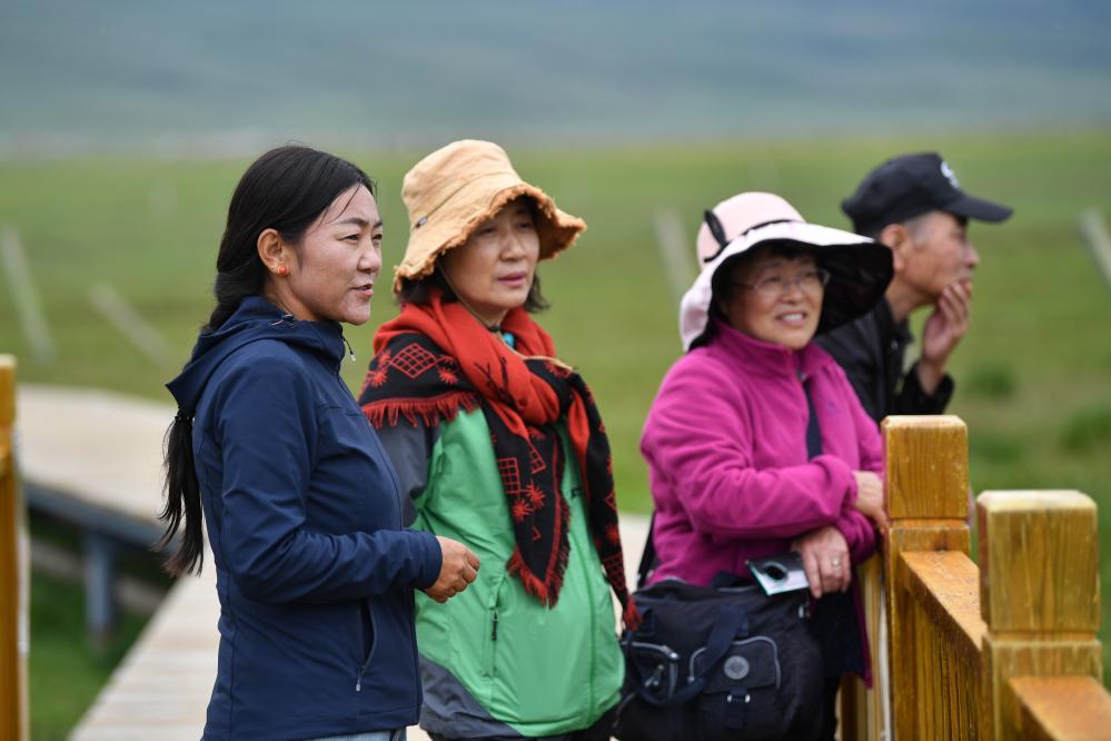 甘肅尕海則岔國家級自然保護區管護中心尕海保護站站長香毛吉(左一)向遊客介紹保護區的野生動植物情況。 新華社記者 陳斌 攝