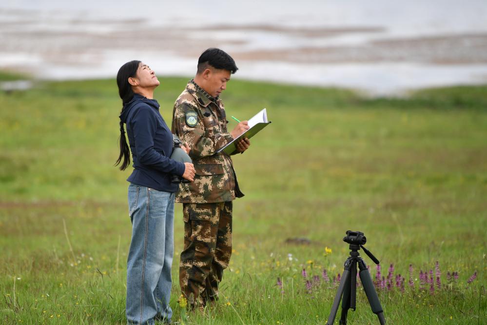 甘肅尕海則岔國家級自然保護區管護中心尕海保護站站長香毛吉(左)和同事在巡護過程中做記錄。 新華社記者 方欣 攝