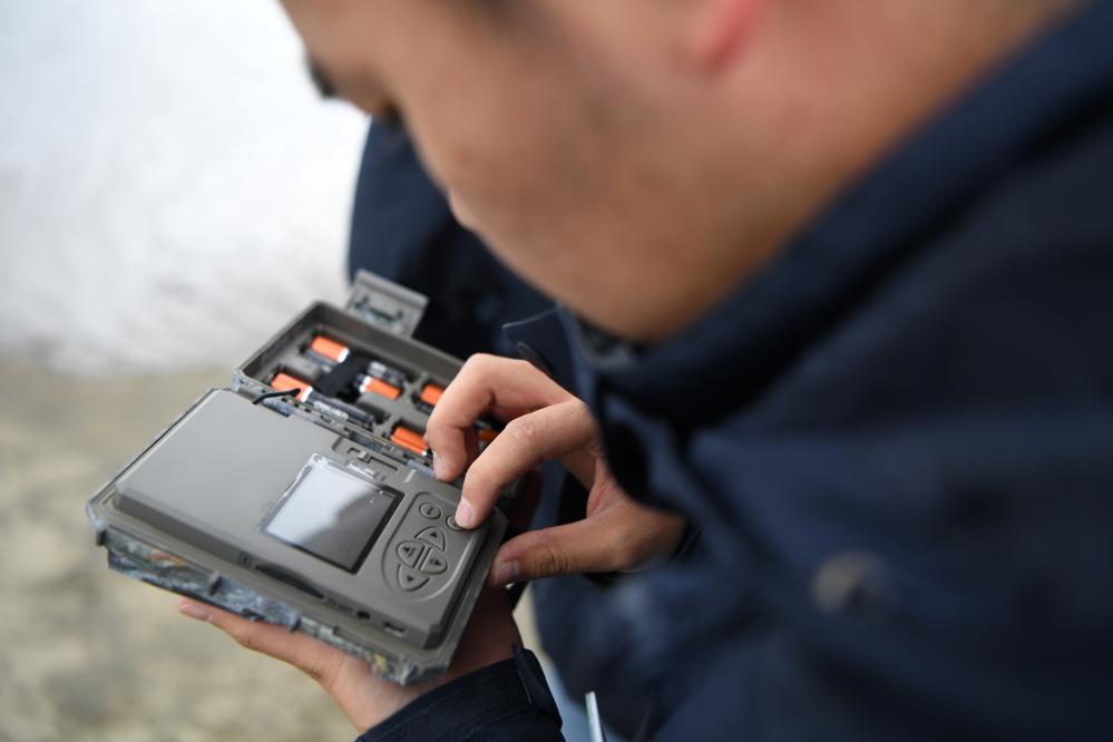 甘肅黃河首曲國家級自然保護區管護中心曼日瑪保護站的工作人員在保護區內(nei) 檢查紅外相機的工作情況。 新華社記者 方欣 攝
