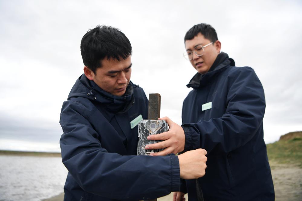 甘肅黃河首曲國家級自然保護區管護中心曼日瑪保護站工作人員王佳陽(右)和同事在保護區內(nei) 安放紅外相機。 新華社記者 張可任 攝