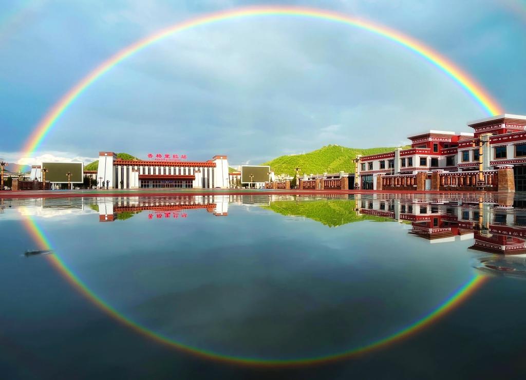9月18日,彩虹下的滇藏鐵路麗(li) 香段香格裏拉站。(中國鐵路昆明局集團公司供圖)