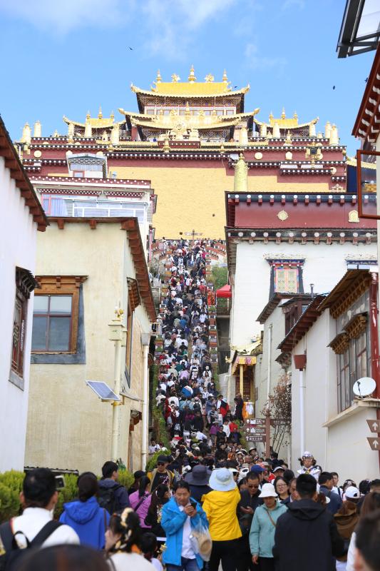 擁有著“小布達拉宮”和“藏族藝術博物館”之稱的噶丹·鬆讚林寺人氣高漲,不少遊客身著藏民族服飾欣喜地在景區寺院的金頂、黃牆下合影留念。景區外車水馬龍,停車場及公路沿線兩(liang) 側(ce) 停滿了來自全國各地的自駕遊車輛,交警及景區工作人員井然有序的指揮著交通。景區內(nei) ,遊客源源不斷,在上車點排起了長隊,工作人員忙碌地指引著遊客按秩序檢票上車,“人實在太多了,假期以來從(cong) 早上7點至晚上7點半都有遊客進出,19輛擺渡車都在不停運行。”一位景區工作人員告訴記者。