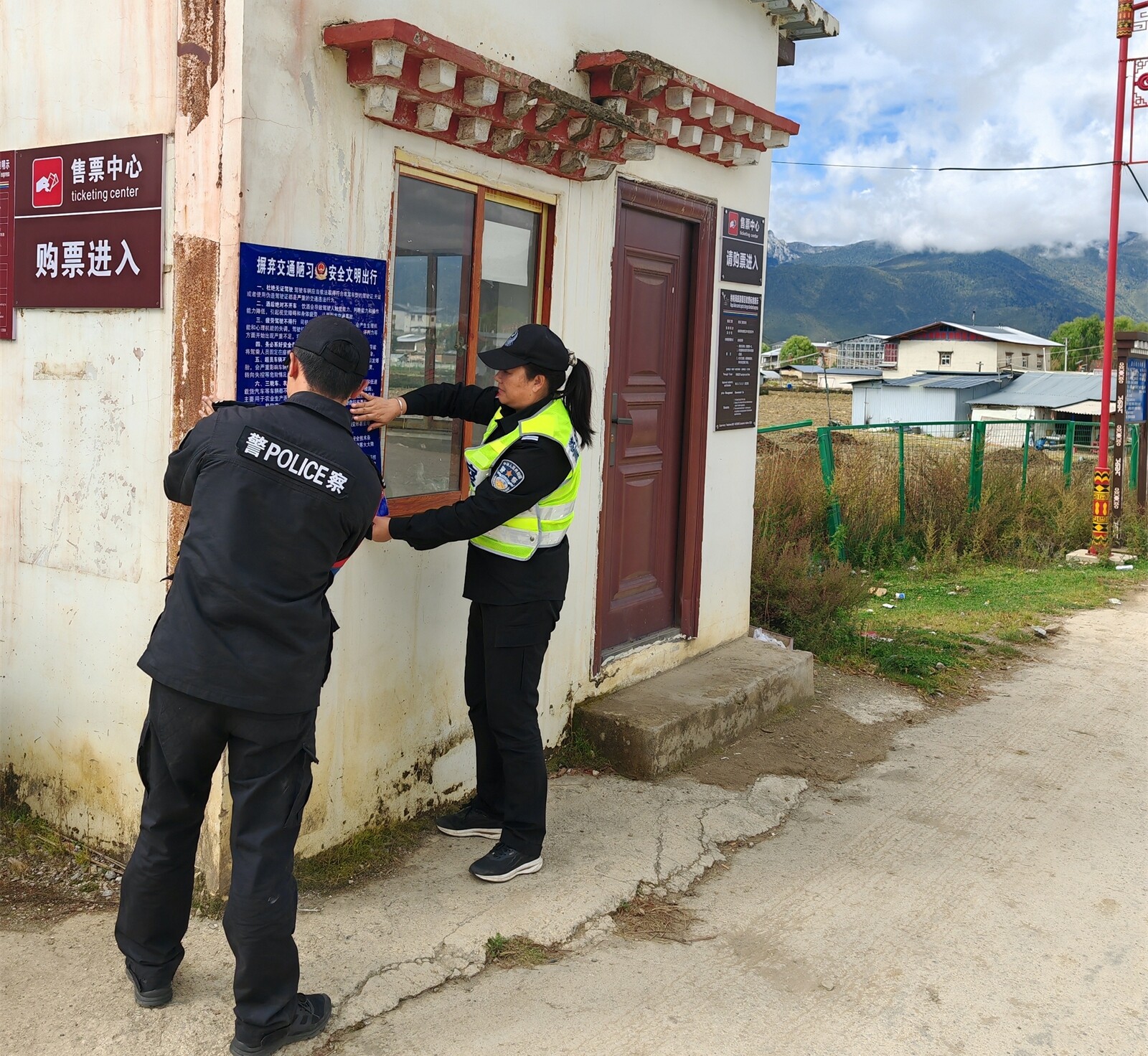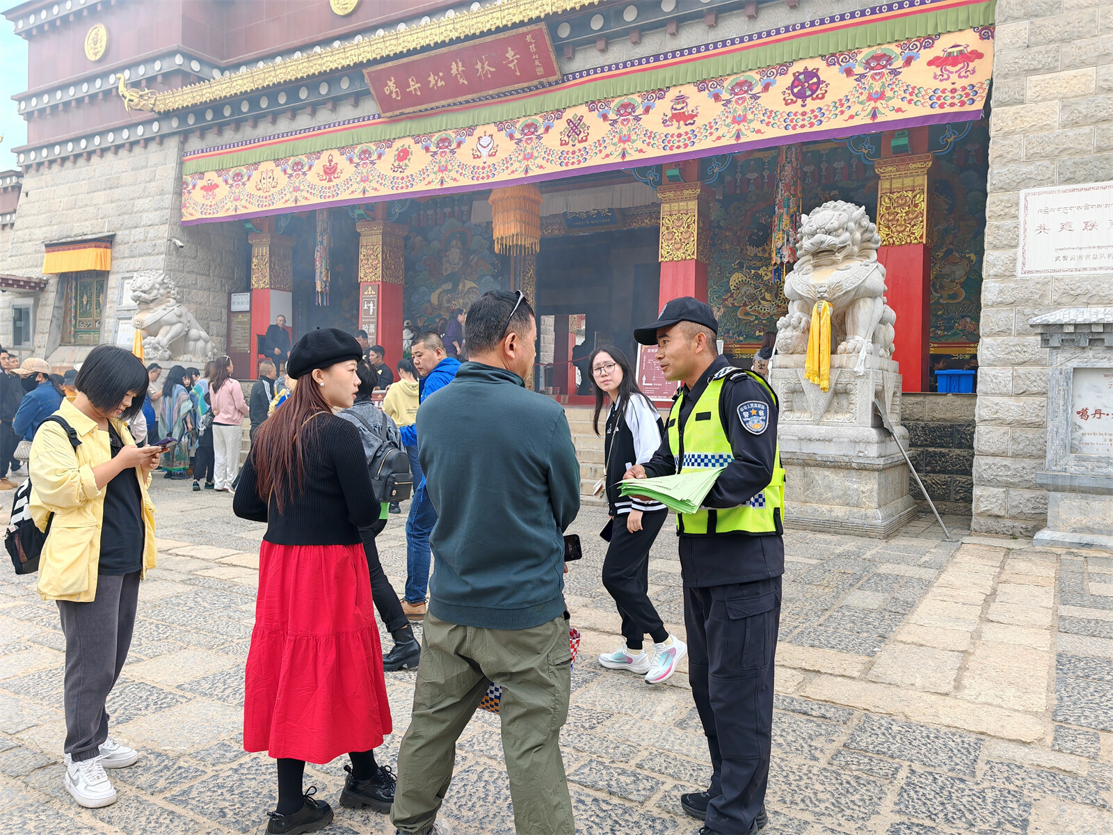 10月1日起,香格裏拉市公安局直屬城市交警大隊組織民輔警走進鬆讚林寺景區、納帕海景區開展交通安全宣傳(chuan) 活動,加強景點路麵管控,確保國慶期間景區道路安全、有序、暢通。