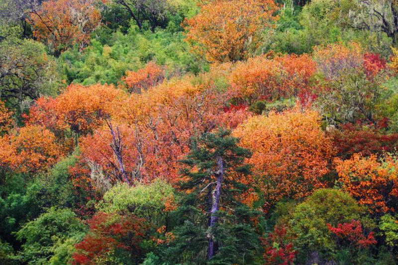 香格裏拉深秋如打翻的調色盤,美不勝收。紅色、黃色、橙色、紫色……這是香格裏拉一年中最色彩斑斕的季節,也是山林入冬前的狂歡。
