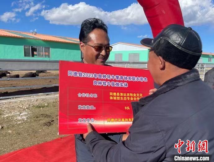 同德縣位於(yu) 黃河流域上遊,草場資源豐(feng) 富,2022年出欄犛牛約8萬(wan) 頭,出欄藏羊約24萬(wan) 隻。23日,當地政府與(yu) 同德巴宗畜牧有限公司通過協議形式,本著互利互惠、共同發展、聯農(nong) 代農(nong) 的原則,為(wei) 當地的合作社和牧民們(men) 發放改良的優(you) 質高原犛牛牛犢,共150頭,該批牛犢年齡均為(wei) 6月—10月。