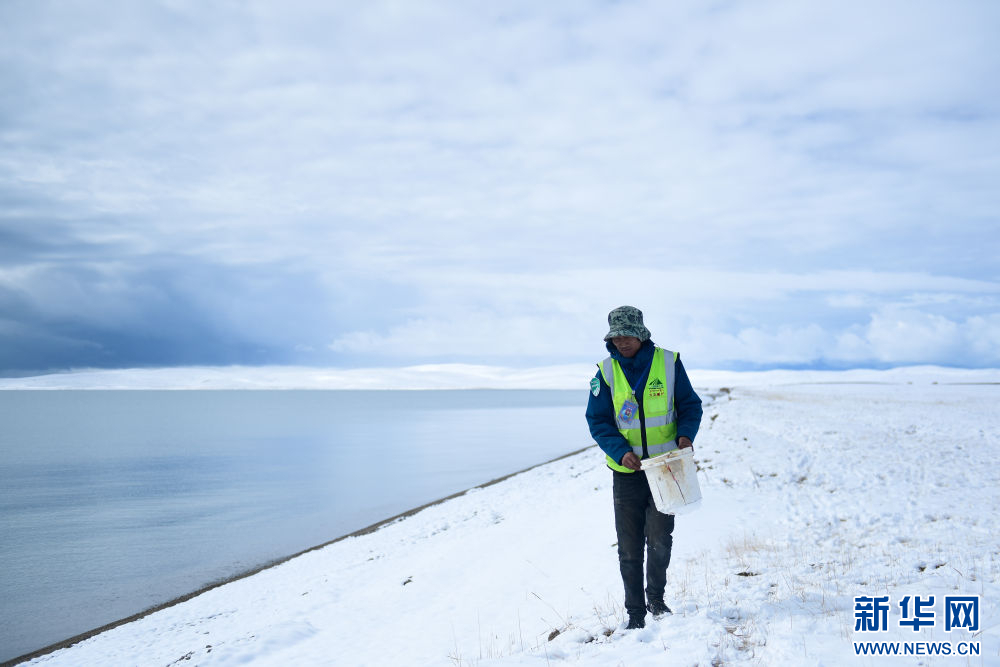 在青海省果洛藏族自治州瑪多縣紮陵湖鄉(xiang) 勒那村,三江源國家公園黃河源園區生態管護員在紮陵湖邊撿拾垃圾。新華社記者 張龍 攝