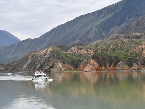 遊客乘坐遊艇在尖紮縣昂拉鄉(xiang) 德吉村附近的黃河遊玩(2020年8月11日攝)。新華社記者 張龍 攝