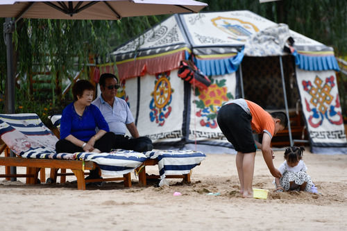 遊客在尖紮縣昂拉鄉(xiang) 德吉村黃河露天沙灘上遊玩(2020年8月11日攝)。新華社記者 張龍 攝