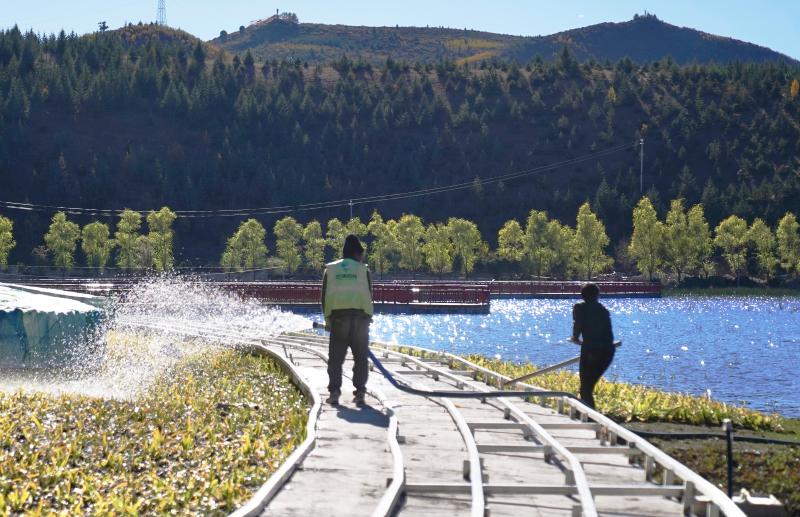 圖為(wei) 工人在拉姆央措湖畔鋪設環湖步行棧道、鋪貼路麵石板。目前,拉姆央措湖保護治理與(yu) 生態修複基礎設施建設工程已完成總工程量的95%,正加緊推進路麵石板鋪貼、木棧道安裝、吸煙亭改造等掃尾工作。拉姆央措湖水清景美煥新顏。