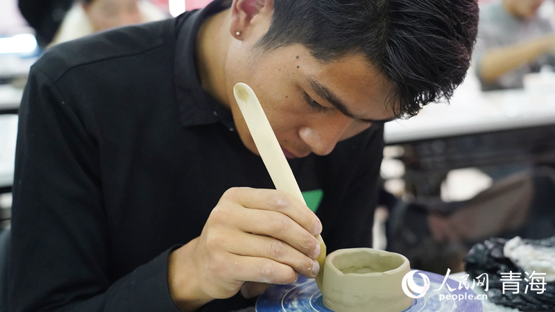 製作陶瓷坯體(ti) ,打磨坯體(ti) 內(nei) 外……踏進班瑪縣電子商務公共服務中心培訓室,十幾名學員正在學做黑陶,拉坯機轉過一圈又一圈,學員們(men) 打磨一遍又一遍,沾著泥巴的雙手,十分專(zhuan) 注的眼神,將人帶入班瑪黑陶的世界,木板與(yu) 土坯摩擦之間,一件件班瑪黑陶作品就此誕生。