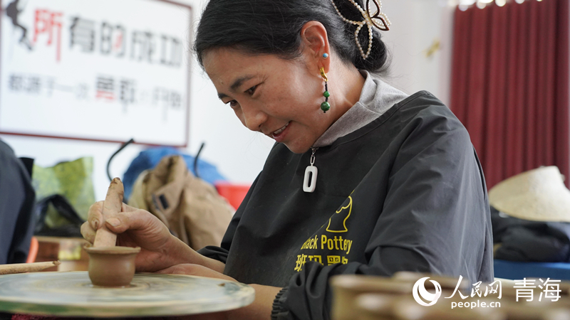 “在這兒(er) 既能在老師的指導下免費學到黑陶製作技藝,還能帶孩子。”青海省果洛藏族自治州班瑪縣瑪可河鄉(xiang) 牧民金措正在打磨一件黑陶器皿,姑娘就坐在旁邊,時而玩泥巴,時而喝牛奶,一雙大眼睛好奇地觀察著四周。
