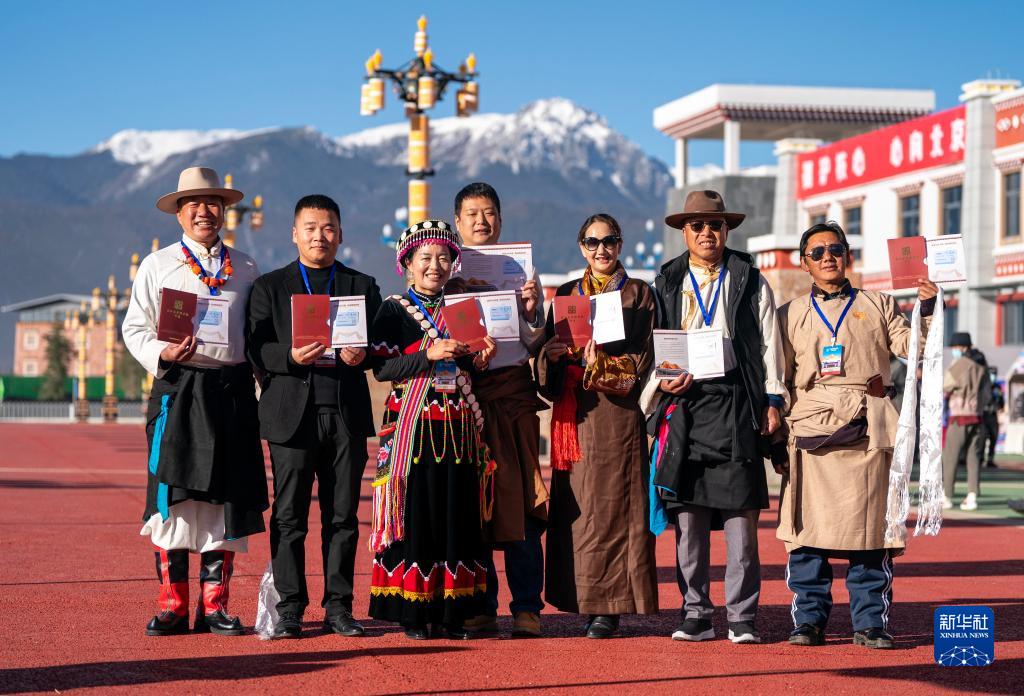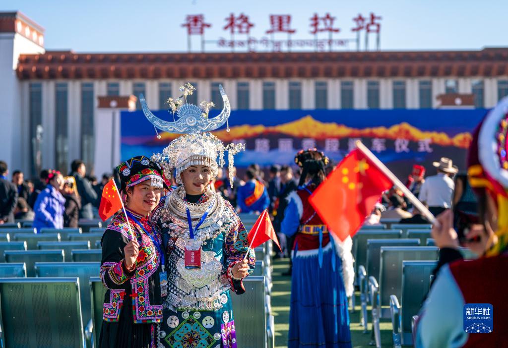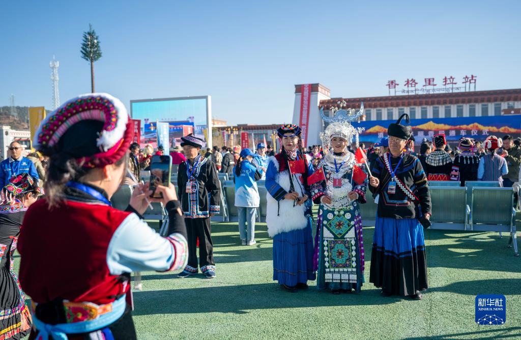 11月26日,參加麗(li) 香鐵路開通儀(yi) 式的嘉賓在香格裏拉站站前廣場手持紀念車票合影。新華社記者 陳欣波 攝