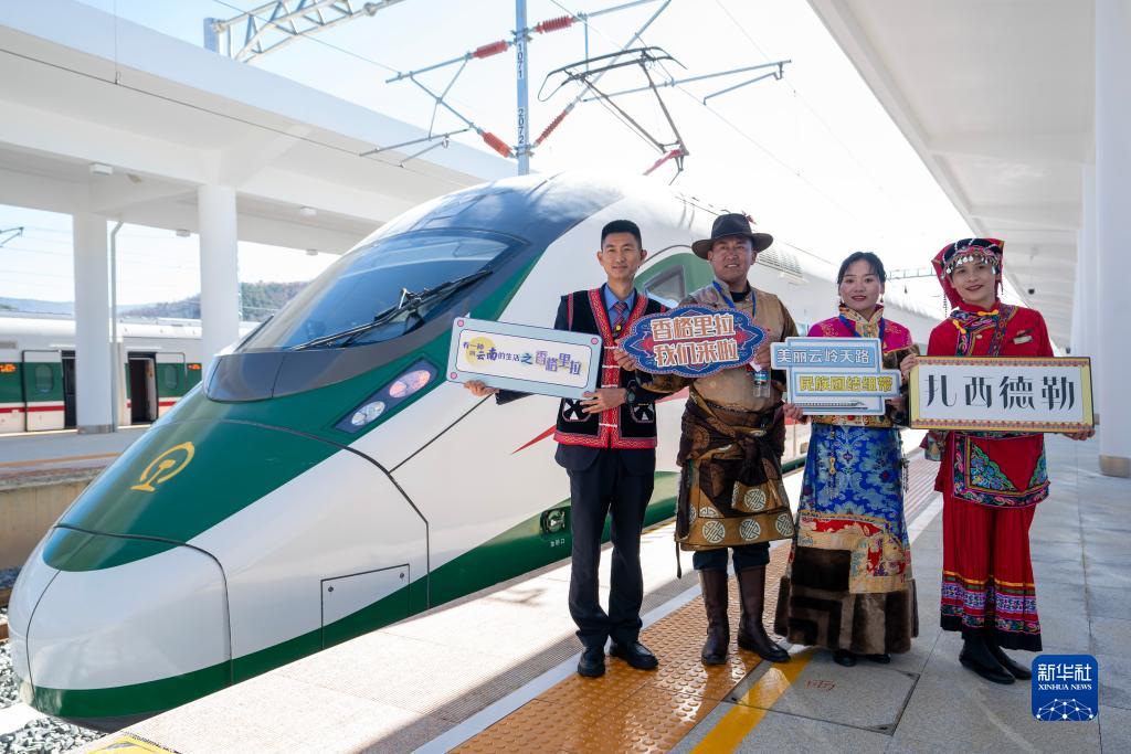 11月26日,乘客(左二、左三)和鐵路工作人員在麗(li) 香鐵路開通首發列車前合影。新華社記者 陳欣波 攝
