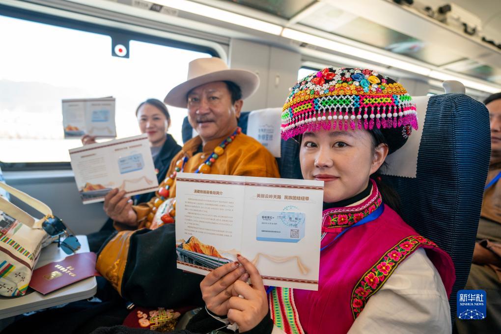11月26日,乘坐麗(li) 香鐵路開通首發列車的嘉賓在車廂內(nei) 展示紀念車票。新華社記者 陳欣波 攝