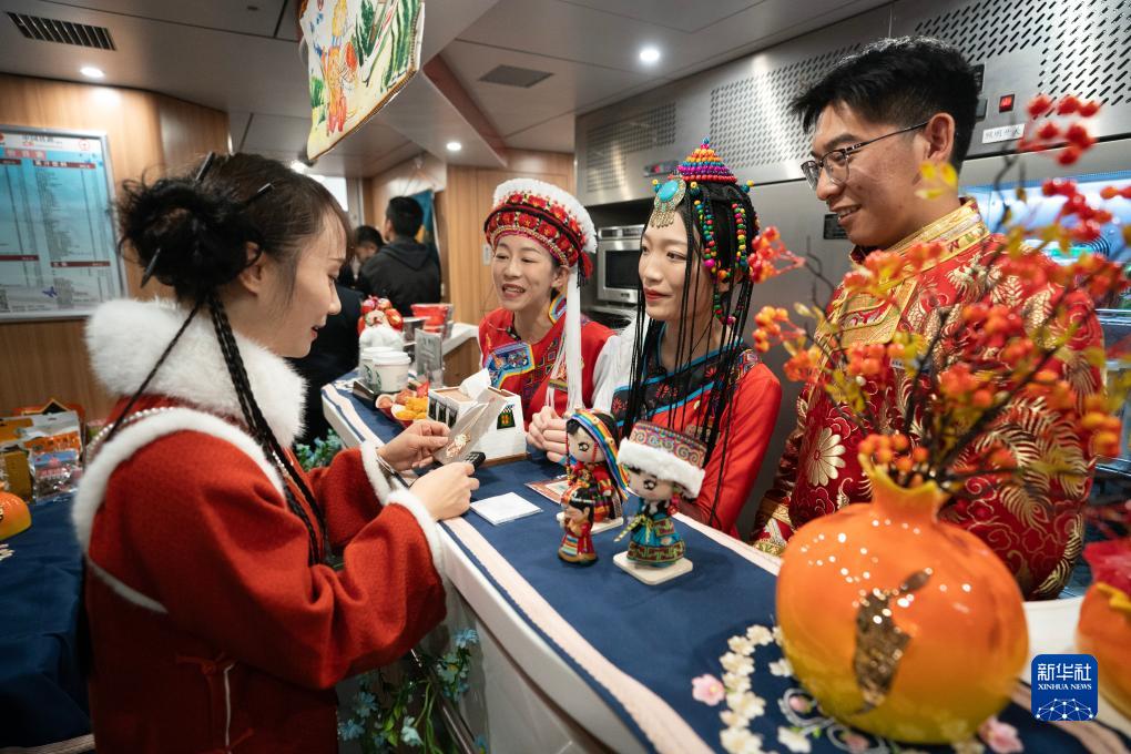 11月26日,乘坐麗(li) 香鐵路首發列車的乘客(左)向列車乘務員谘詢紀念品。新華社記者 陳欣波 攝