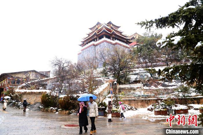圖為(wei) 遊客遊覽雪中的獨克宗古城。鄒鵬 攝