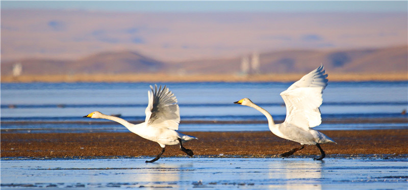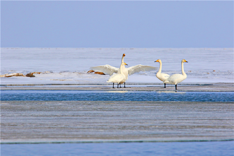 冬日的青海湖,一碧千裏沒有雜色。湖麵像一層薄薄的透明玻璃,晶瑩剔透,湖岸周圍是金黃的草場,遠處是高聳入雲的雪峰,潔白的天鵝恰似水中仙子,伸展雙翼,引翅拍水,蕩漾著水波,構成一幅冬日美景圖。[詳細] -