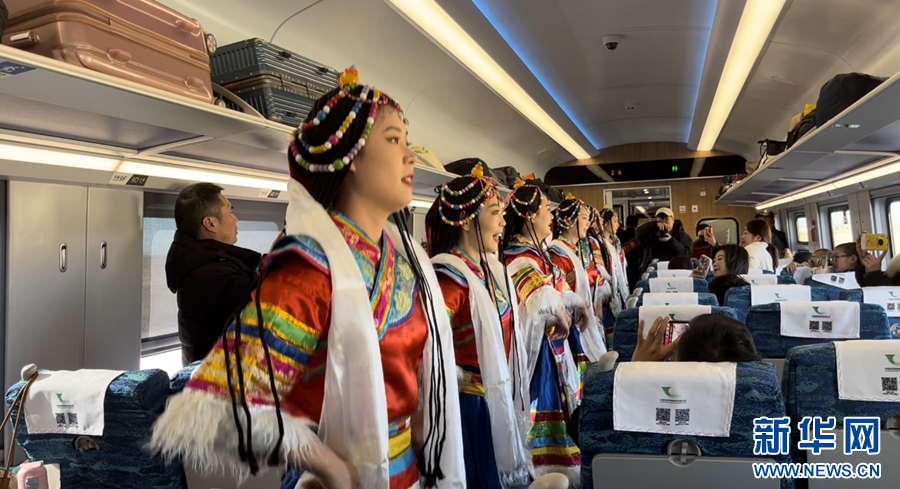 “提前祝各位旅客新春快樂(le) ,吉祥如意,紮西德勒!”藏族舞蹈《吉祥歡歌》把車廂內(nei) 的氛圍推入高潮,鐵路職工身著藏族服飾,歡快的音樂(le) 和動人的舞姿令人陶醉,乘客們(men) 的情緒也被帶動起來,隨著表演者們(men) 一起拍手歌唱。