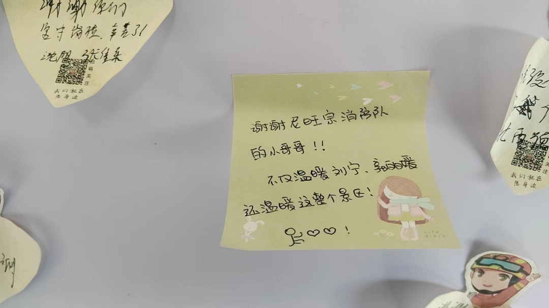 隊員們(men) 細致暖心的幫助與(yu) 關(guan) 懷,讓兩(liang) 位遠方的朋友萬(wan) 分感激,並主動在“藍焰貼心服務留言牆”留下了他們(men) 最簡單最純真最溫暖的話語:“謝謝尼旺宗消防隊的小哥哥,不僅(jin) 溫暖劉寧、郭麗(li) 媛,還溫暖這整個(ge) 景區!”