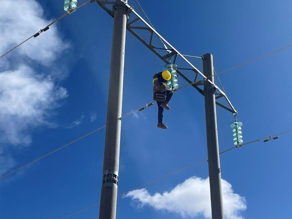 風吹得高壓線輕輕晃動,鐵軌兩(liang) 邊都被白雪覆蓋,大家剛一下車就感受到了來自唐古拉的寒意。“今天檢修任務是布強格至唐古拉北45號杆塔至245號杆塔,重點是線路、絕緣子檢修、鐵塔、電杆狀態檢查等工作,海拔高、氣溫低,裝備穿戴笨重,登高作業(ye) 大家要注意防止跌倒、墜落。”應忠學怕自己的聲音被風吹得模糊,他又大聲喊了一遍,保證每個(ge) 人都能聽到。