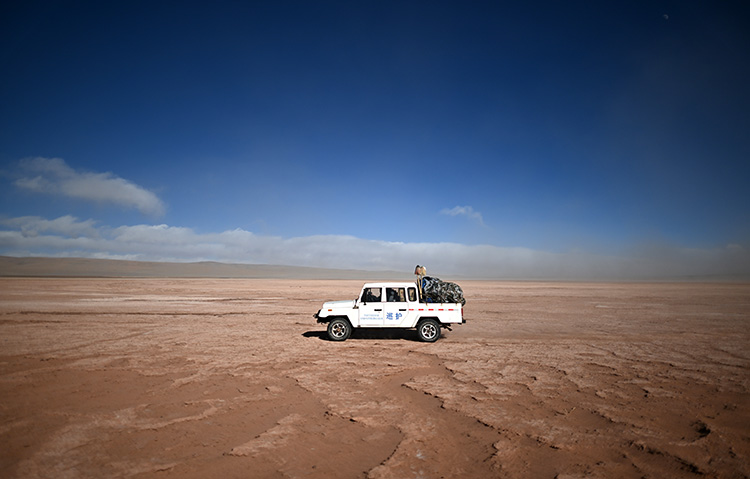 1月19日,在可可西裏卓乃湖區域附近,可可西裏森林公安局巡山車輛在巡查途中。(張宏祥 攝)