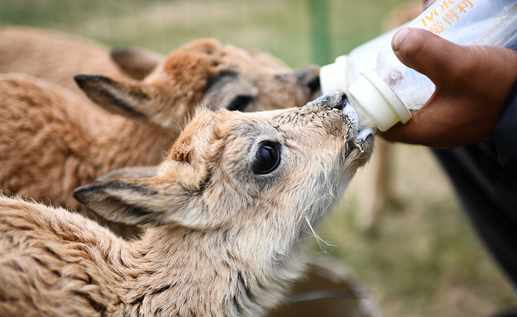 2023年7月28日,可可西裏管理處索南達傑保護站隊員才仁多傑在給被救助的藏羚羊幼仔喂奶。(張宏祥 攝)