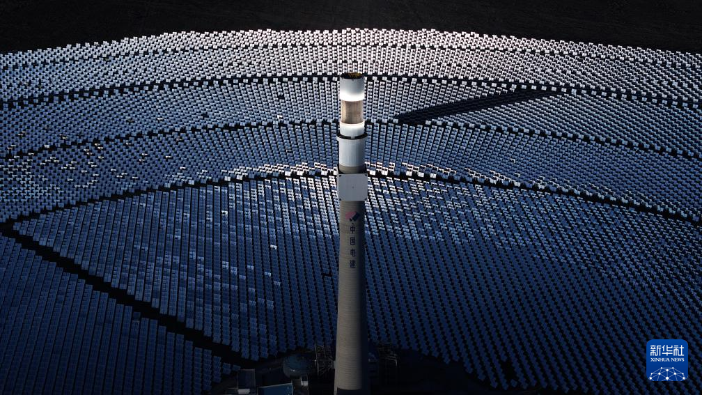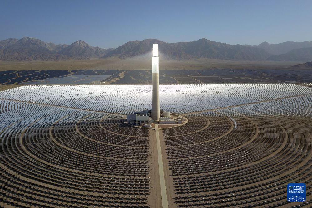 這是2022年6月8日在海西州德令哈市光伏(光熱)產(chan) 業(ye) 園拍攝的光熱電站(無人機照片)。新華社記者 範培珅 攝