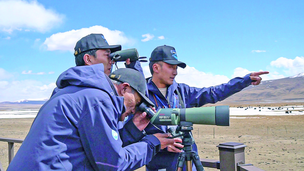 巴桑才仁和兩(liang) 名濕地生態管護員調整著單筒望遠鏡的角度,找尋著“鳥中大熊貓”黑頸鶴的身影。很快,他們(men) 就輕鬆“鎖定”。