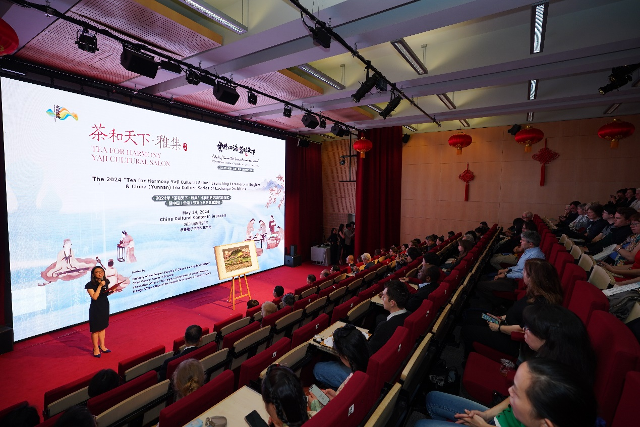 這幅作品由中國著名藝術家賀昆創作,通過木板套刻和層層渲染,鐫刻了全球首個(ge) 茶主題世界文化遺產(chan) “普洱景邁山古茶林文化景觀”人、茶、林共生的美好畫麵。當地時間5月24日,在布魯塞爾中國文化中心舉(ju) 辦的“茶和天下·雅集”比利時站活動啟動儀(yi) 式暨中國(雲(yun) 南)茶文化係列交流活動上,現場揭幕了這幅來自雲(yun) 南的作品。
