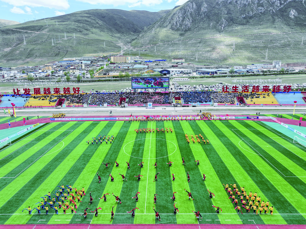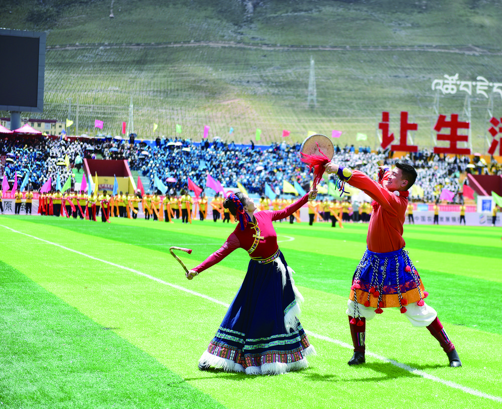 13時30分,一曲精彩的《熱巴舞》拉開開幕式序幕,現場觀眾(zhong) 熱情似火,掌聲不斷。“飛躍的玉樹足球,有我揮灑的青春……”隨著本土歌手嘎瑪西周創作的歌曲《點燃夢想》唱響,玉樹犛牛隊主場氛圍“拉滿”。