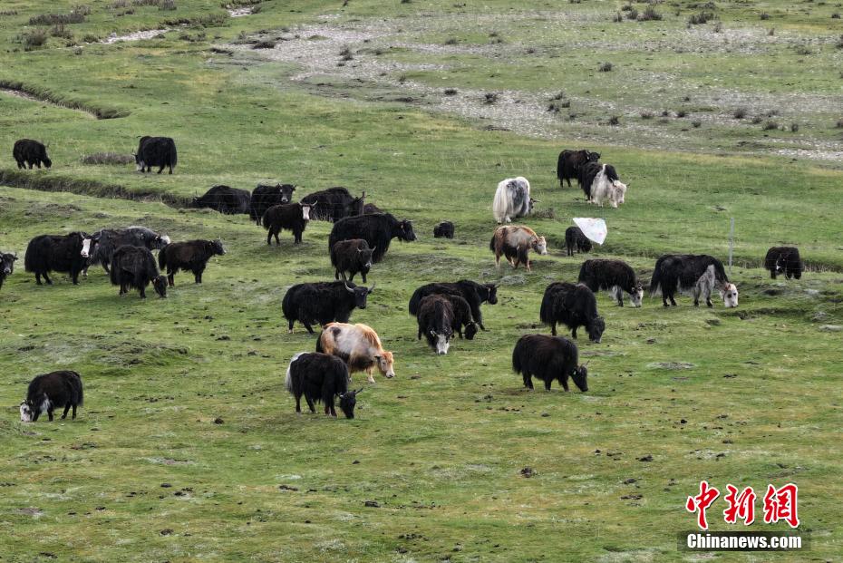 6月4日,航拍青海省海北藏族自治州剛察縣草原上,成群犛牛正在覓食。(無人機照片)馬銘言 攝